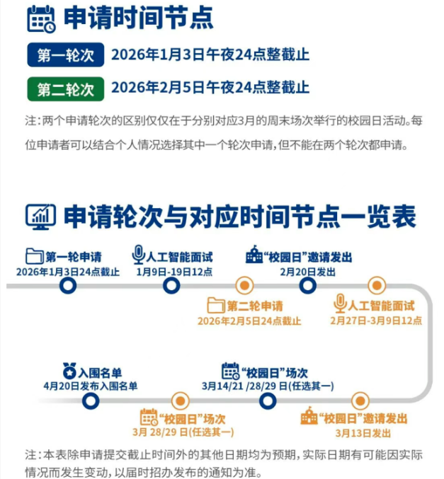 昆山杜克大学2026年综合评价招生面向全国22省(市、区)招生,申请系统预计于12月1日开启,申请设置两轮通道,考生可灵活选择:第一轮截止:2026年1月3日;第二轮截止:2026年2月5日。