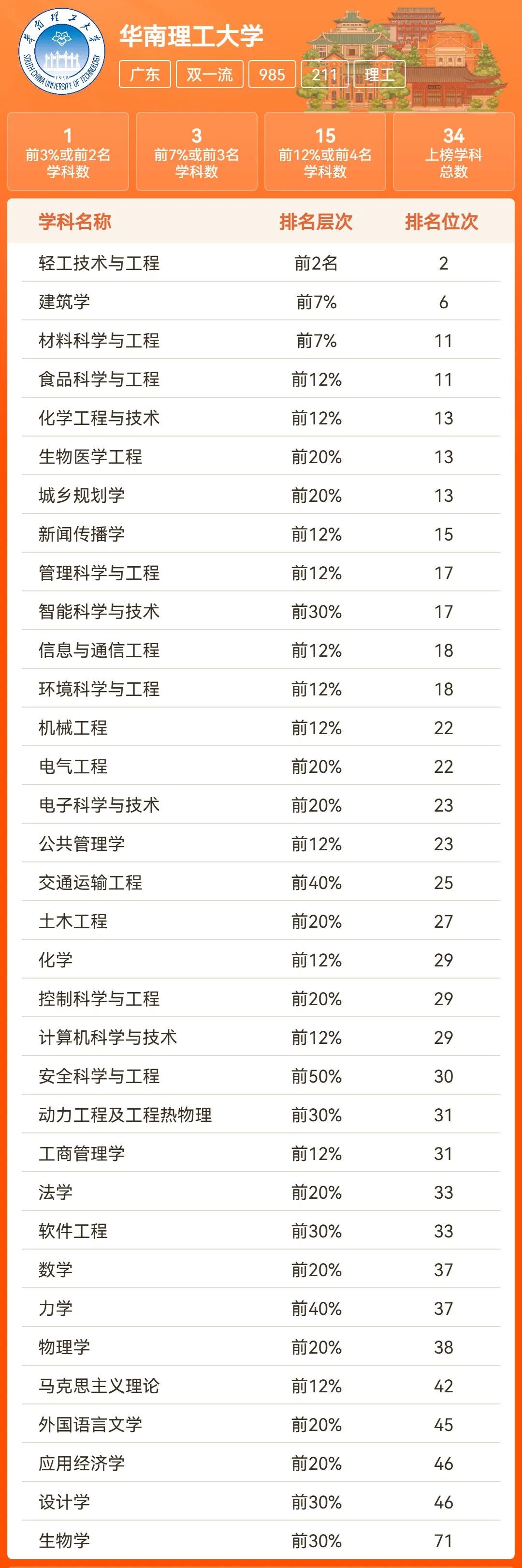 华南理工大学工科优势明显,在2025年软科中国最好学科排名中,共34个学科上榜,其中轻工技术与工程专业跻身全国前2名,3个学科进入前7%,15个学科位列前12%;建筑学、材料科学与工程、化学工程与技术、生物医药工程、电气工程等多个理工类学科均处于全国前列。