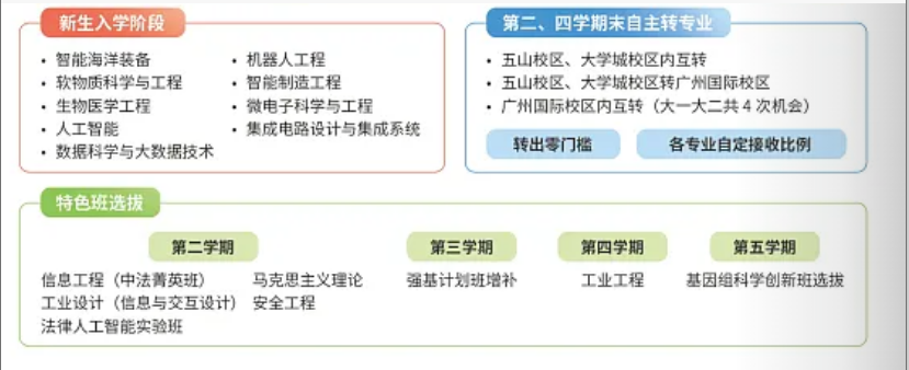 为进一步提高学生转专业的自主性,实施灵活的转专业制度,前四学期均可申请转专业,满足学生跨类选专业的需求学校对各专业接收转入人数不设上限,由各院(系)自定(艺术类、运动训练、强基计划、工业设计(中外合作办学)等特殊类除外)。