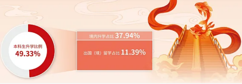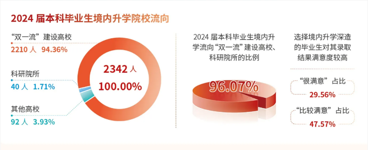 37.94%的本科生选择境内深造,学生留在本校或前往国内“双一流”重点高校或中国科学院等科研单位。