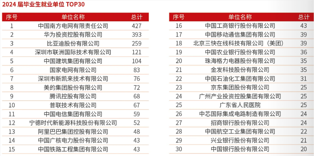 大部分选择就业的毕业生进入世界500强企业,如华为、比亚迪、中国航发南方工业有限公司等企业。