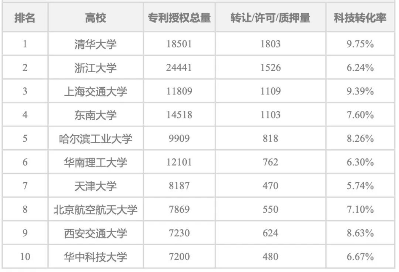 国内专利综合竞争力十强高校科技成果转化率: