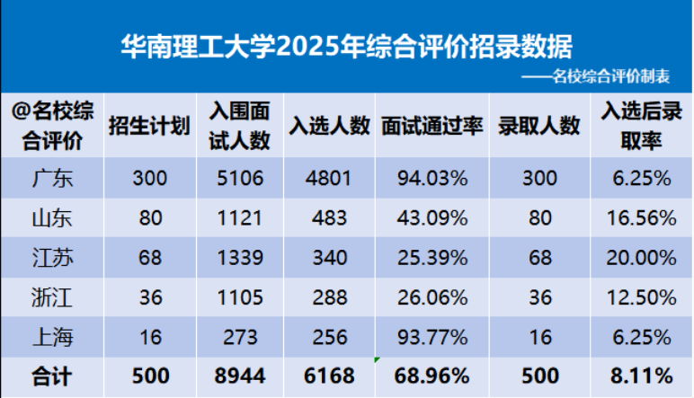 华南理工大学2025年综合评价招生500人,入围面试人数8944人,入选人数6168人,录取人数500人,面试通过率68.96%,入选后录取率8.11%。各省市招录数据如下图所示。