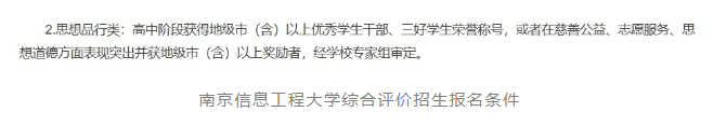 如省级三好学生、优秀团员、优秀干部等。其中浙江、江苏等省份的院校对思想品德更关注,也在招生简章中对学生做出要求。