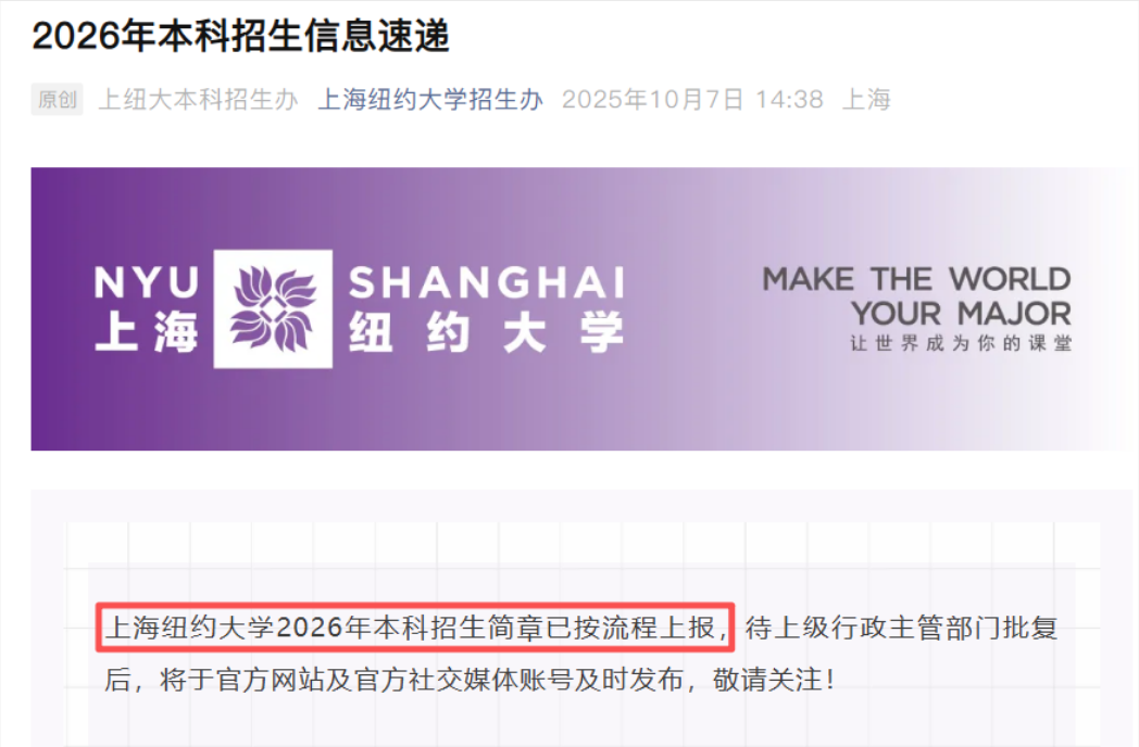 在2025年10月7日,上纽招生办公众号就已发布:26年简章已上传,待批复后发布!