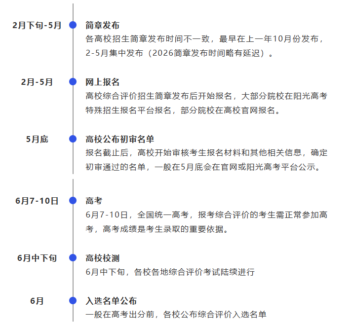 根据往年综合评价进程,梳理2026年综合评价招生流程,以供考生家长参考: