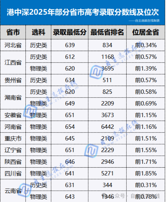 4、录取分数线:以下为港中深2025年部分省市录取分数线及位次排名,供考生家长参考↓