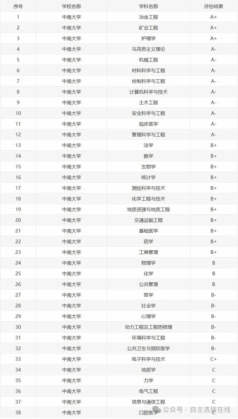 在第四轮学科评估中,中南大学有3个A+专业,9个A-专业。以下是具体的学科评估结果。