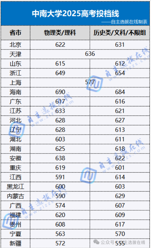 自主选拔在线为大家汇总整理了中南大学2025各省市高考投档分数线数据,供各位考生家长参考。