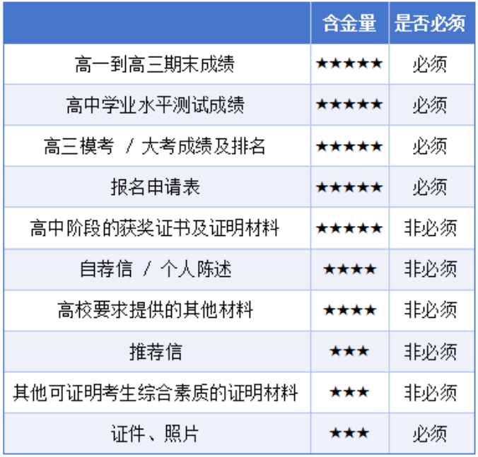 结合综合评价招生院校往年情况来看,综合评价报名材料通常包括以下10项内容: