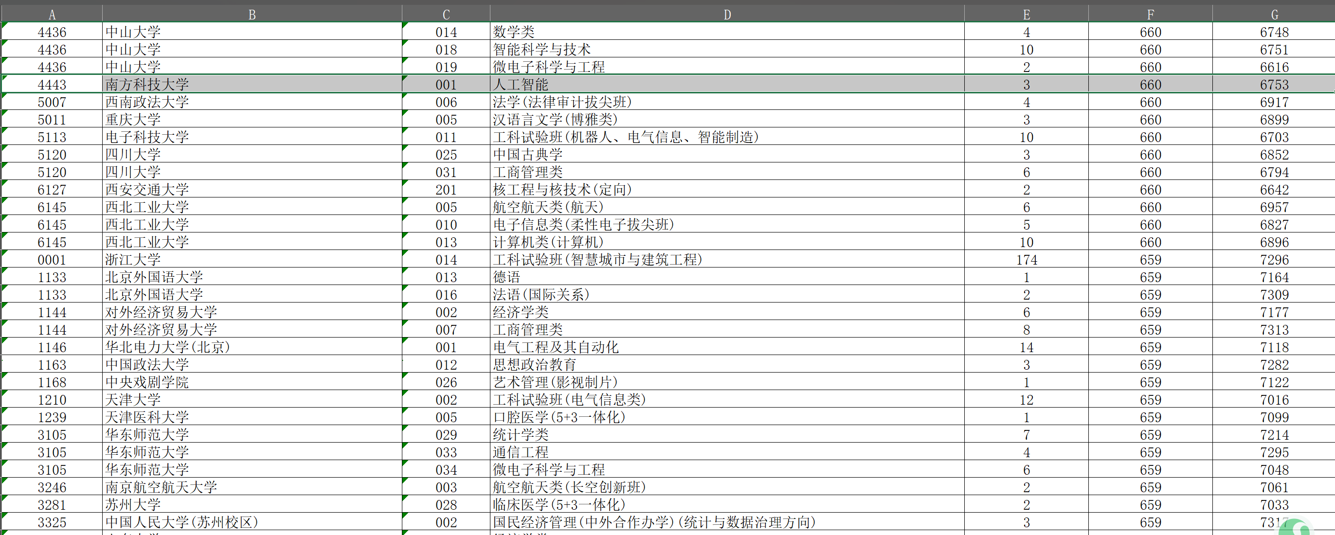 另据《浙江省2025年普通高校招生普通类第一段平行投档分数线表》显示,南方科技大学人工智能专业投档计划数是3人,分数线是660分,位次是6753名。分数线高于浙江大学、南京航空航天大学、中国政法大学、中山大学等名校的部分专业。