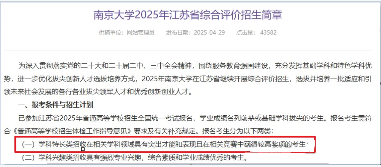 部分高校把竞赛奖项作为报考条件选项之一,如南京大学学科特长类招收在相关学科领域具有突出才能和表现且在相关竞赛中获得较高奖项的考生;