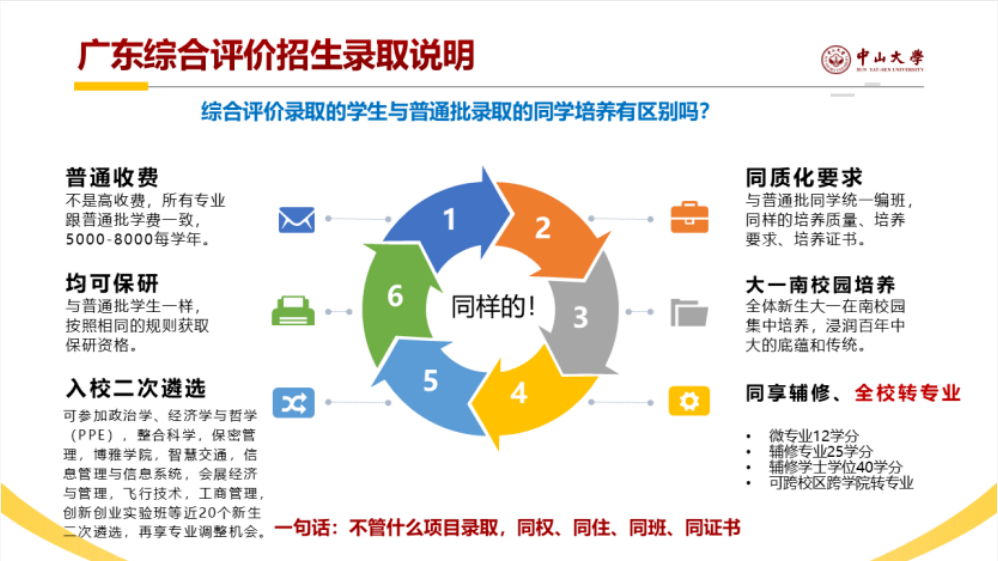 综合评价录取的考生,培养质量及要求、转专业、学费、证书等同普通批录取的考生一致。同学们进入中大学习后,拥有各种转专业、辅修、读研、二次遴选等学习方式,全校各校区院系的专业都提供了让你跨学科学习的机会。