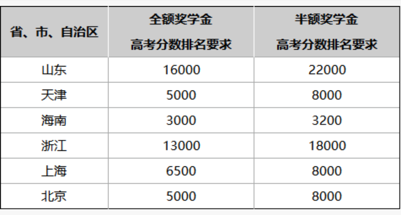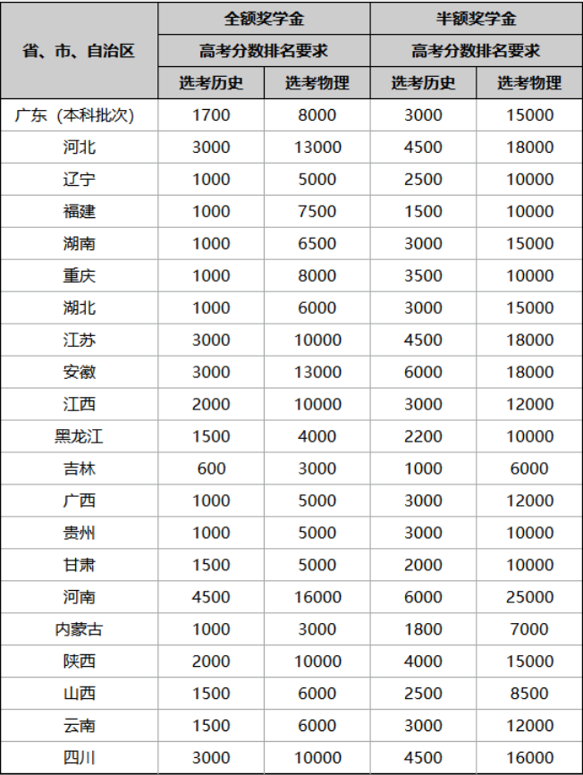1、学校本科新生入学全额及半额奖学金获奖条件:高考分数排名或高考文化分总分须满足以下要求: