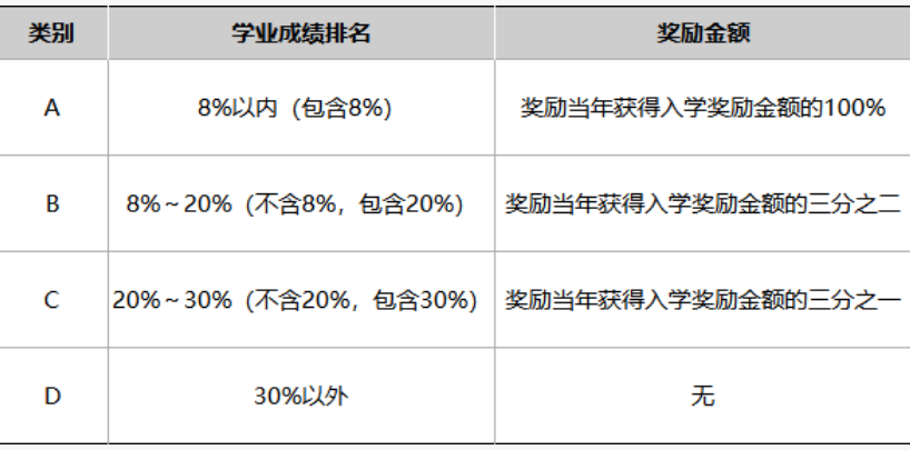 9、全额及半额奖学金续得成绩要求:全额及半额奖学金的发放原则上为期四年,每学年结束后须进行续得审核。为鼓励更多成绩优秀的学生在学业上继续努力,根据学生上一个学年度的平均成绩(YGPA)排名(本年级或本年级本专业或本年级本大类,以排名最前的数据为准)进行审核,排名及相应的续得奖学金金额如下: