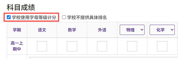 2. 若学校使用的计分制位非常规(非数字计分制),请选择“My school uses letter grade (英文版)/学校使用字母等级计分(中文版)”,即可在表格里输入你的非数字成绩: