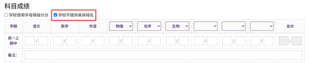 3. 若学校不提供具体排名信息,请选择“My school does not provide ranking information (英文版)/ 学校不提供具体排名(中文版)”,你将无需填写考试排名信息: