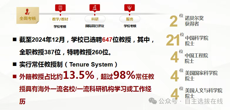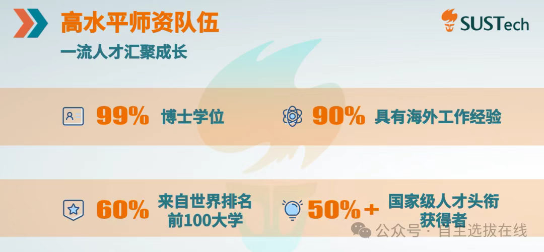 南科大师资力量国内顶尖。截至目前,南科大院士57人,教学科研系列教师90%以上具有海外工作经验,60%以上具有在世界排名前100名大学工作或学习的经历,高层次人才占教研系列50%以上,在国内名列前茅。