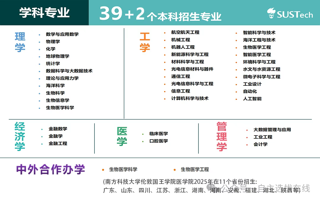 2025年南科大新增人工智能、口腔医学2个本科专业,共有39个专业可供自主选择,此外,还有2个中外合作办学专业由南方科技大学伦敦国王学院医学院开设,2025年在广东、山东等11个省份招生。