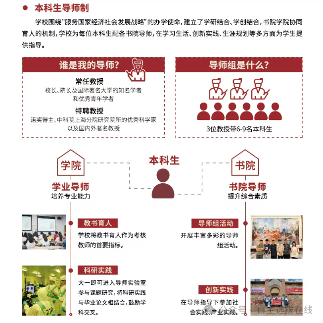 “学院+书院”协同育人,本科生导师组由3名教授、6-9名本科生组成,四年全过程指导。学院导师培养专业能力,书院导师提升综合素质。
