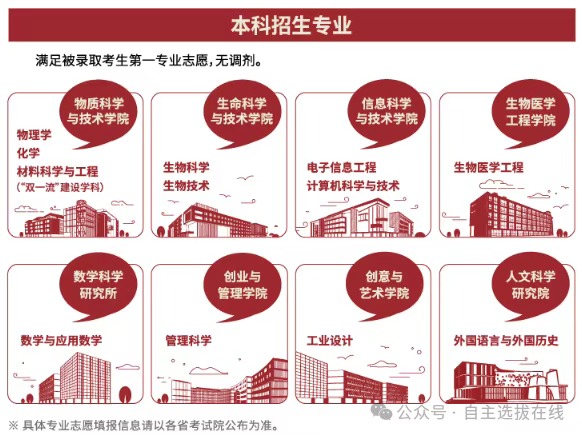 注:上科大在高考录取阶段满足所有被录取考生的第一专业志愿,入学后为符合条件的学生提供公开公正的再次选择专业的机会。