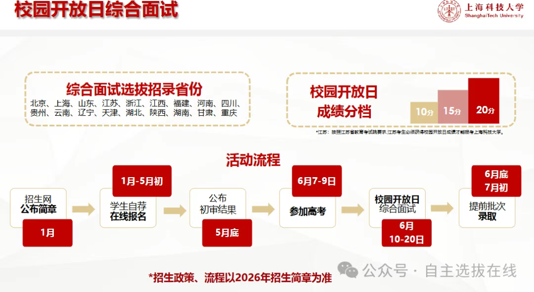 上科大将根据考生申请材料及“校园开放日”活动整体表现进行综合评定,表现优秀的学生将获得“校园开放日”成绩。