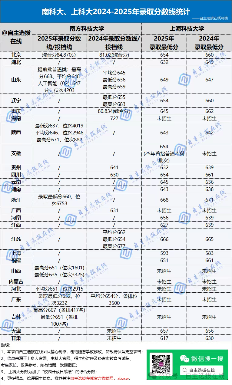 自主选拔在线团队根据两校官网、各省市教育考试院、招办讲座及考生家长分享数据,汇总整理了南方科技大学及上海科技大学2024-2025年综合评价分数线,其中南科大分数为不完全统计,上科大分数为综合成绩,供考生家长参考。