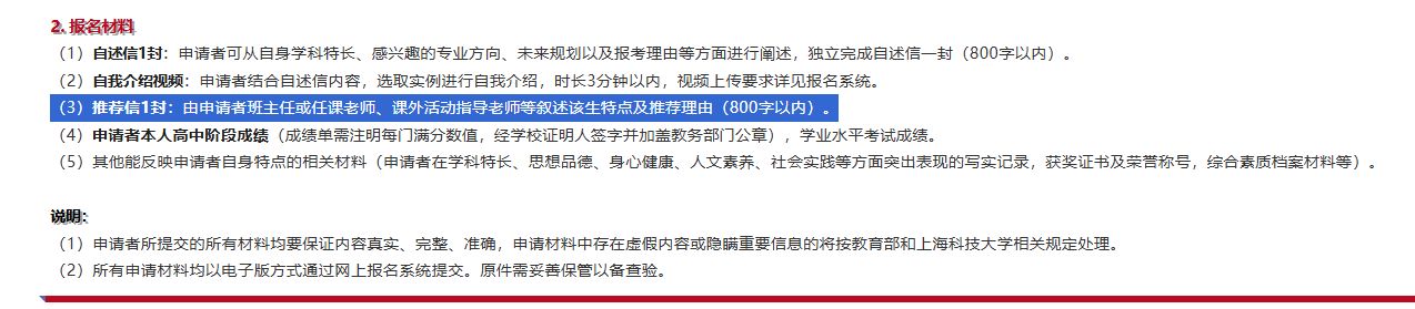 2026年上海科技大学综评的推荐信有什么要求?