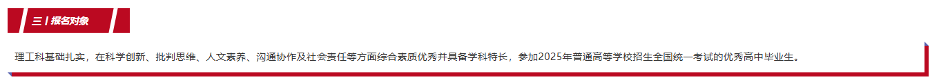 | 报名对象 | 要求考生“具备学科特长”。 | “学科特长”是一个宽泛概念,竞赛获奖是重要体现,但非唯一方式。扎实的学科基础、突出的单科成绩、深入的课题研究、创新的实践作品等,都能证明特长。 |