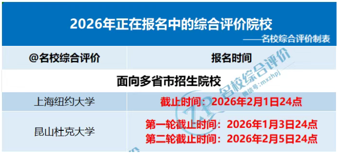 2026年将有90+所院校进行综合评价招生。目前,上海纽约大学和昆山杜克大学2026年综合评价招生简章已发布,最早将于2月初截止报名,准备报考这两所高校的考生家长抓紧时间报名了!
