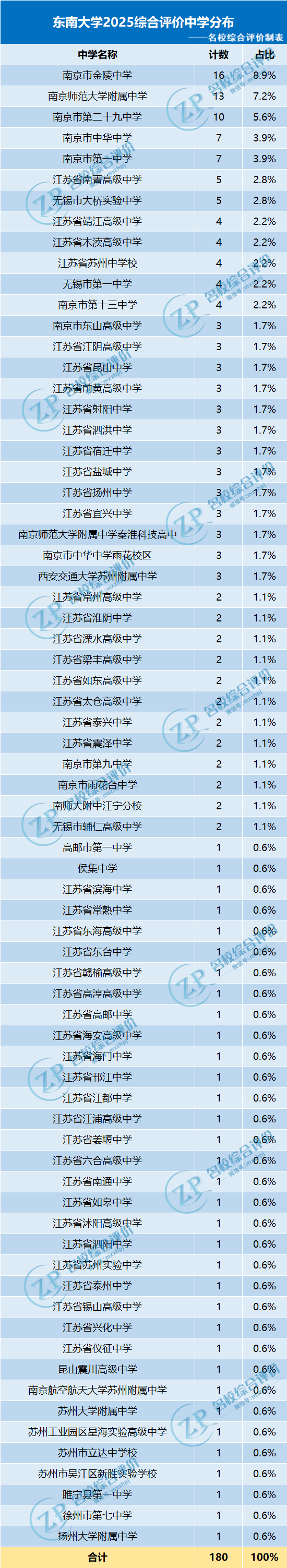以上中学的考生家长可以重点关注下东南大学的综合评价,东南大学2025年综合评价中学分布情况详情如下: