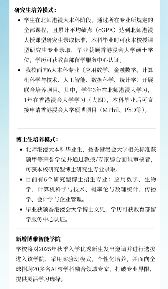学校2025年推出:和港浸大携手推出的“3+1+X”计划、博雅智能学院等项目。