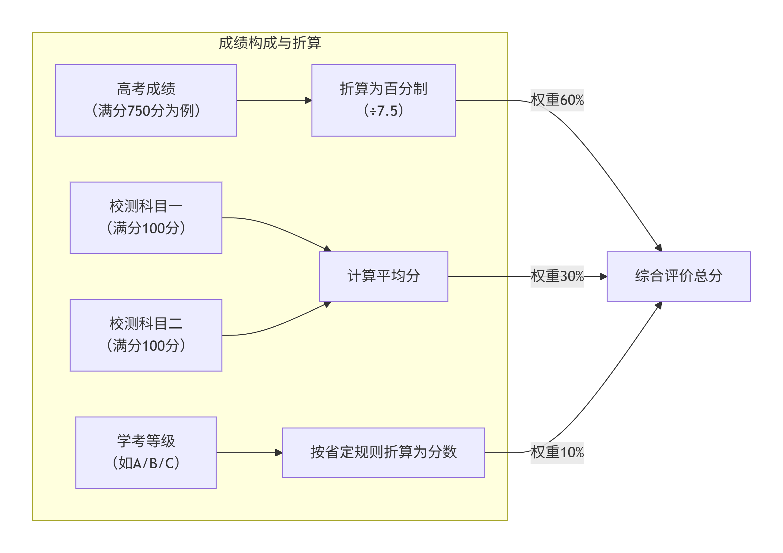 综合评价总分 = 高考成绩(折算成百分制) × 60% + 学校测试成绩(平均分) × 30% + 高中学业水平考试成绩(折算分) × 10%