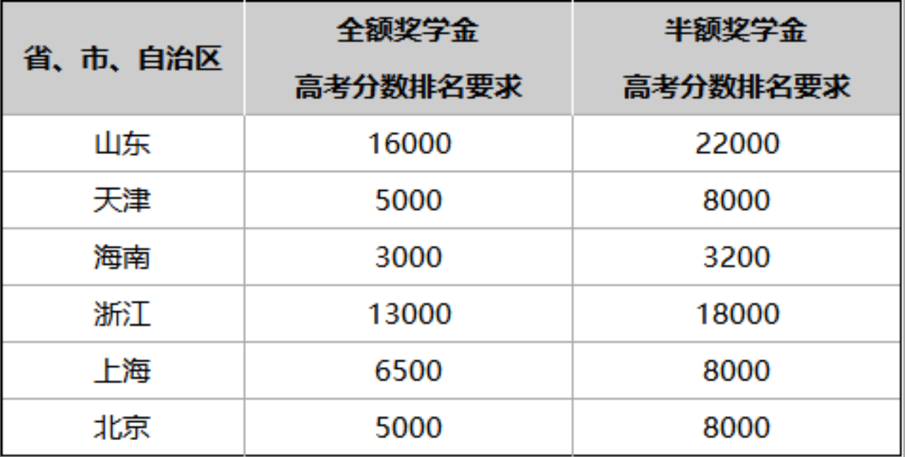 1.学校本科新生入学全额及半额奖学金获奖条件:高考分数排名或高考文化分总分须满足以下要求: