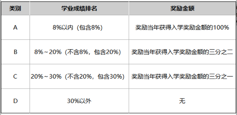 9.全额及半额奖学金续得成绩要求:全额及半额奖学金的发放原则上为期四年,每学年结束后须进行续得审核。为鼓励更多成绩优秀的学生在学业上继续努力,根据学生上一个学年度的平均成绩(YGPA)排名(本年级或本年级本专业或本年级本大类,以排名最前的数据为准)进行审核,排名及相应的续得奖学金金额如下: