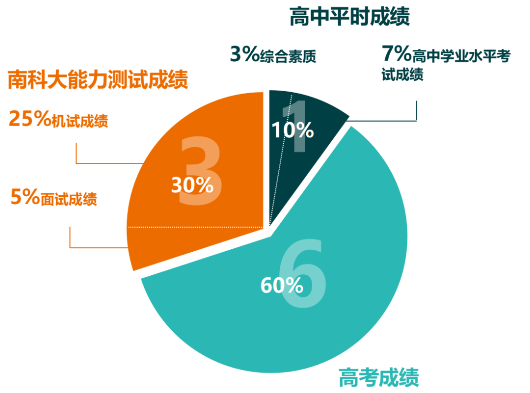 南科大打破一考定终身的高校考试招生制度,率先采用基于高考的综合评价录取模式招收本科生。(即高考成绩占60%,能力测试成绩占30%,高中平时成绩占10%,按考生"631"综合成绩排名从高到低录取)