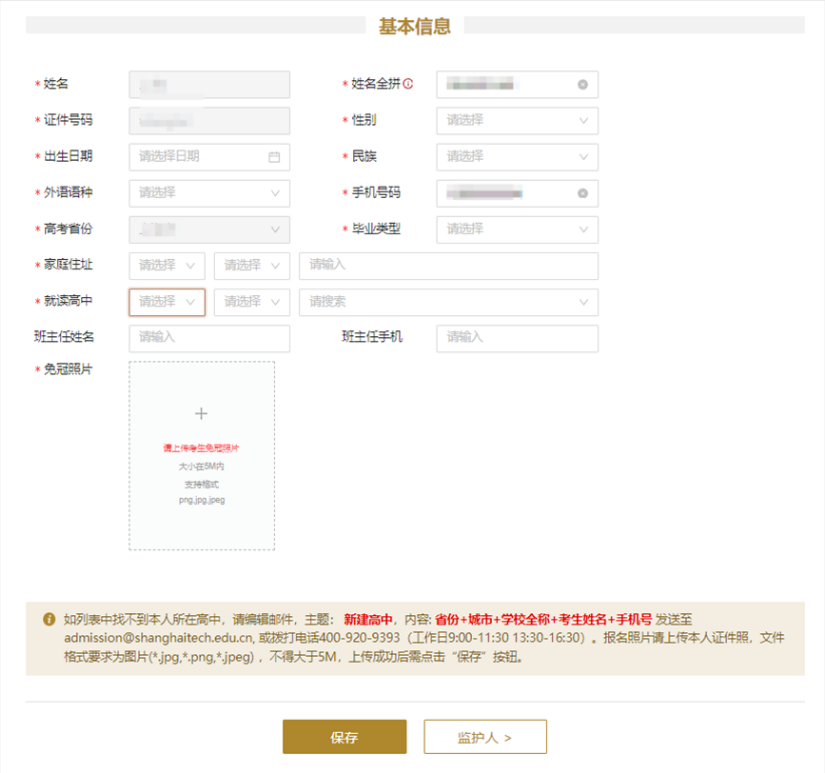 3.按照顺序填写【基本信息】、【监护人】、【选考科目】、【教育经历】、【高中学习成绩】、【竞赛获奖】、【荣誉称号】、【课外经历】和【资料上传】。在完成某一模块的填写后请及时点击 “保存”按钮,系统会自动进行校验并通过提示框提示保存状态。