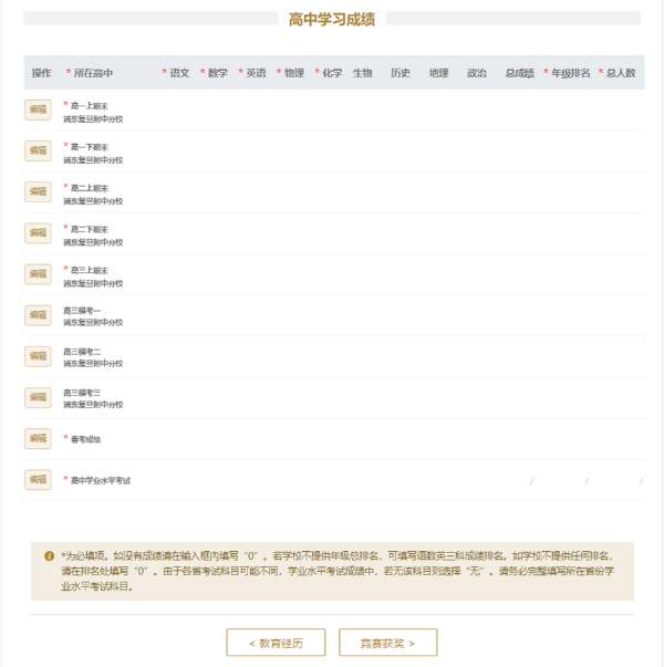 7.【高中学习成绩】模块中,高一上期末、高一下期末、高二上期末、高二下期末、高三上期末、高中学业水平考试成绩属于必填内容,高三模考一、高三模考二、高三模考三属于选填内容。复读考生需填写复读上期末、复读模考一的成绩和排名。语文、数学、英语、物理、化学为必填项,如没有成绩请在输入框內填写“0”。年级排名、年级人数为必填项,如学校不提供所有科目总排名,可填写语数英三科成绩排名。如学校无法提供任何排名,请在排名处填写“0”。上海考生须填写春考成绩,浙江考生须填写首考成绩。请务必完整填写所在省份学业水平考试科目成绩。