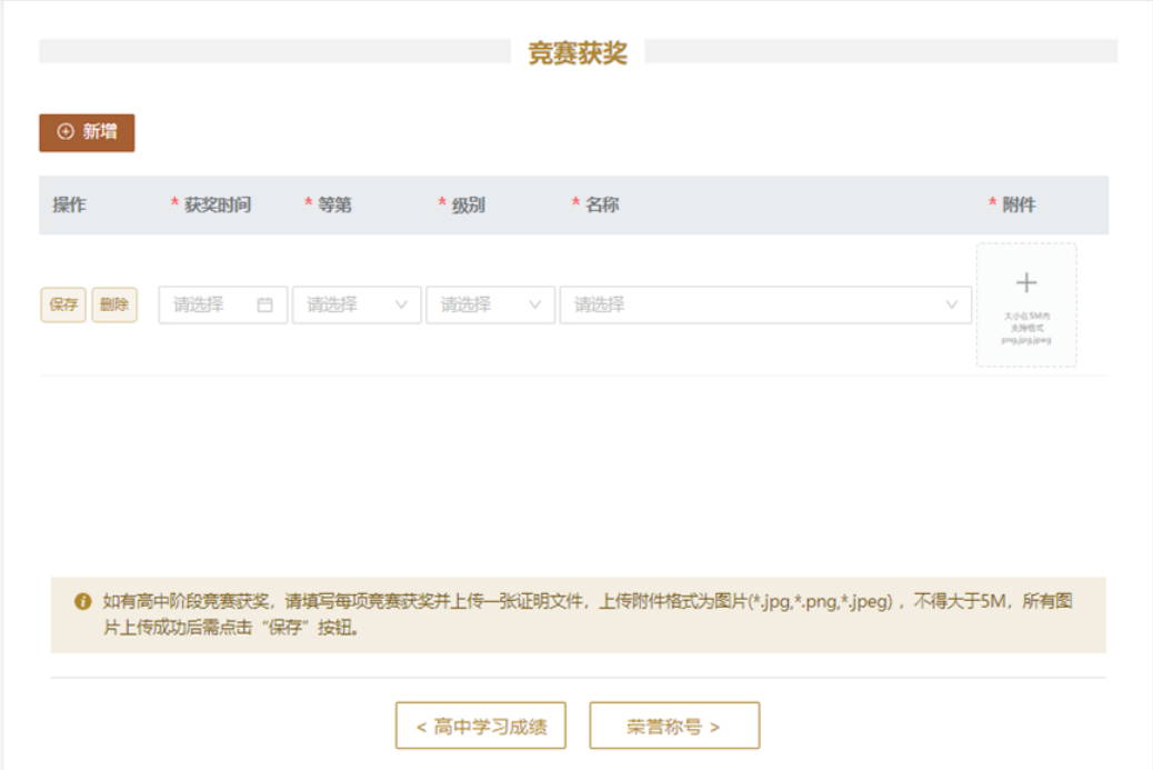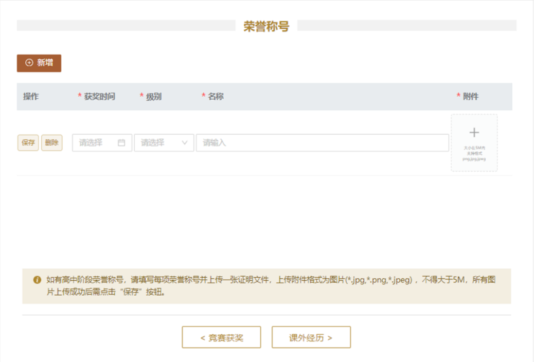 9.【荣誉称号】模块为选填项。该部分仅需填写高中阶段的荣誉称号,每项荣誉称号须上传一张证明文件,上传文件格式为图片(*.jpg,*.png,*.jpeg),不得大于5M,图片上传成功后需点击“保存”按钮。