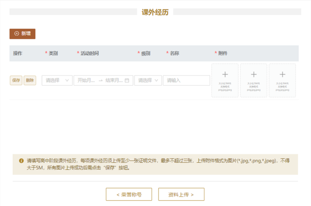 10.【课外经历】模块为选填项。该部分仅需填写高中阶段课外经历,每项课外经历须上传至少一张证明文件,最多不超过三张,上传文件格式为图片(*.jpg,*.png,*.jpeg),不得大于5M,图片上传成功后需点击“保存”按钮。