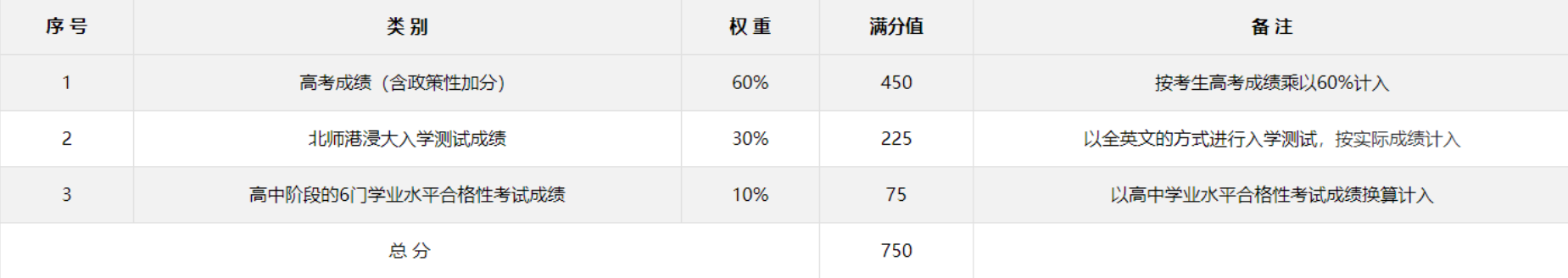 综合评价录取总成绩满分为750分。其中,高考成绩(含政策性加分)按60%的比例计入;北师港浸大入学测试成绩满分为225分,按实际成绩计入;考生高中阶段的思想政治、历史、地理、物理、化学、生物学6门学业水平合格性考试科目成绩均须达到合格,并按对应等级折算办法计入学业水平合格性考试成绩。