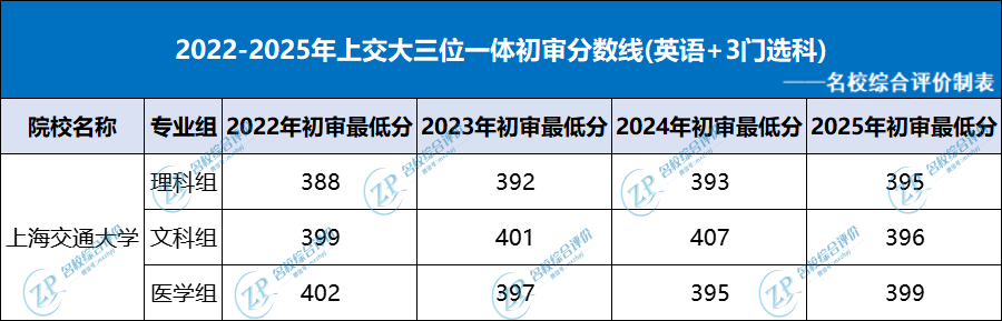 上交近四年的三位一体首考入围分数基本都在390分以上,以下是2022-2025年上交三位一体初审入围分数线: