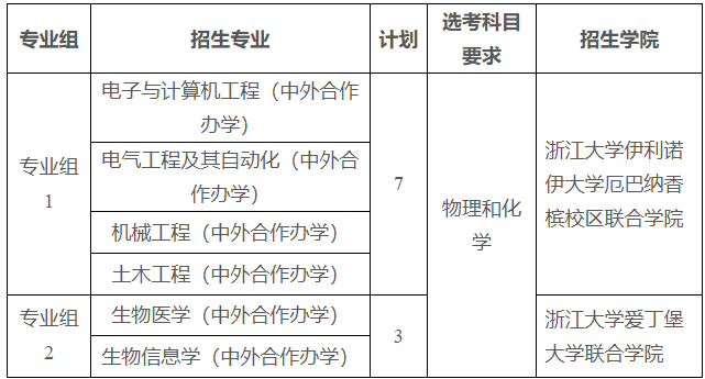 注1:浙江大学伊利诺伊大学厄巴纳香槟校区联合学院招生的4个专业为一个院校专业组,共用7个招生计划,浙江大学爱丁堡大学联合学院招生的2个专业为一个院校专业组,共用3个招生计划。