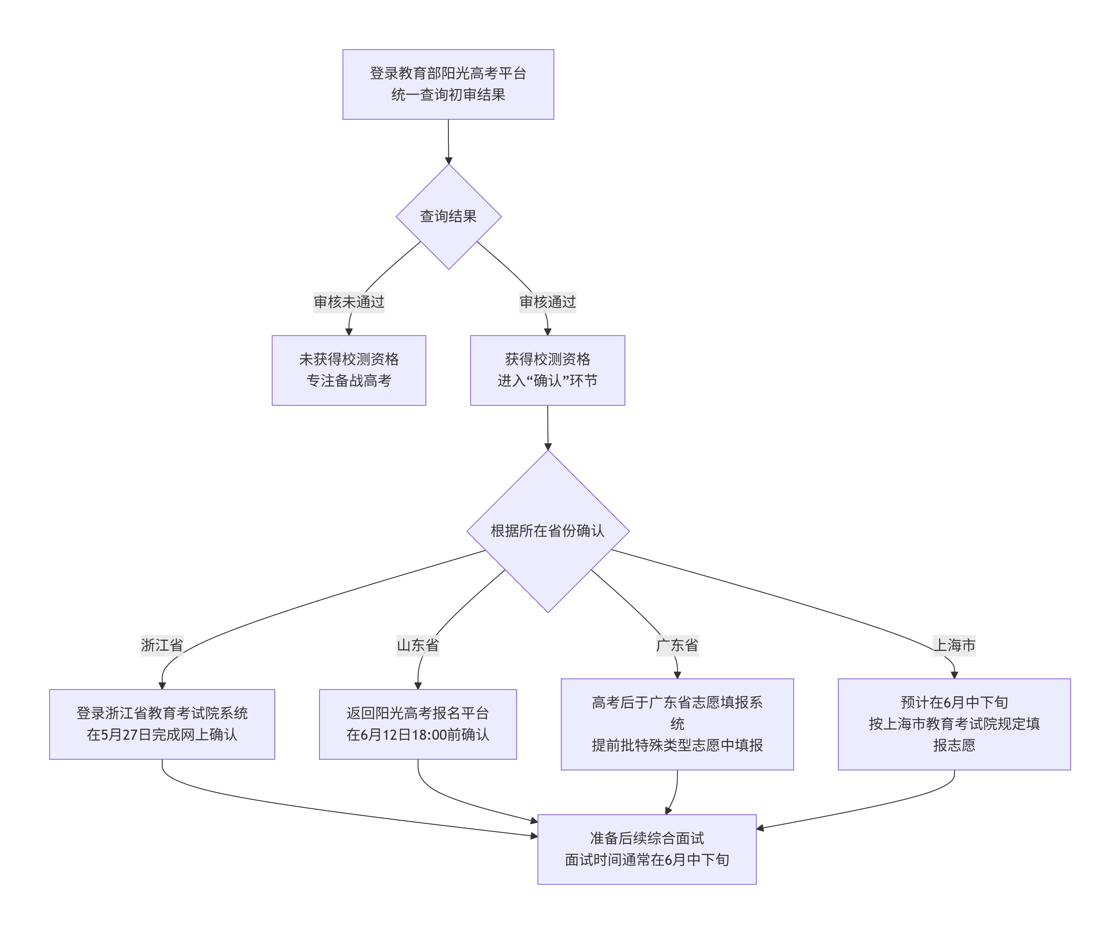 查询到“审核通过”仅仅是第一步,接下来根据本省招生简章和通知完成“确认”步骤,才是真正锁定面试资格的关键。下图清晰地展示了从统一查询到分省确认的全过程: