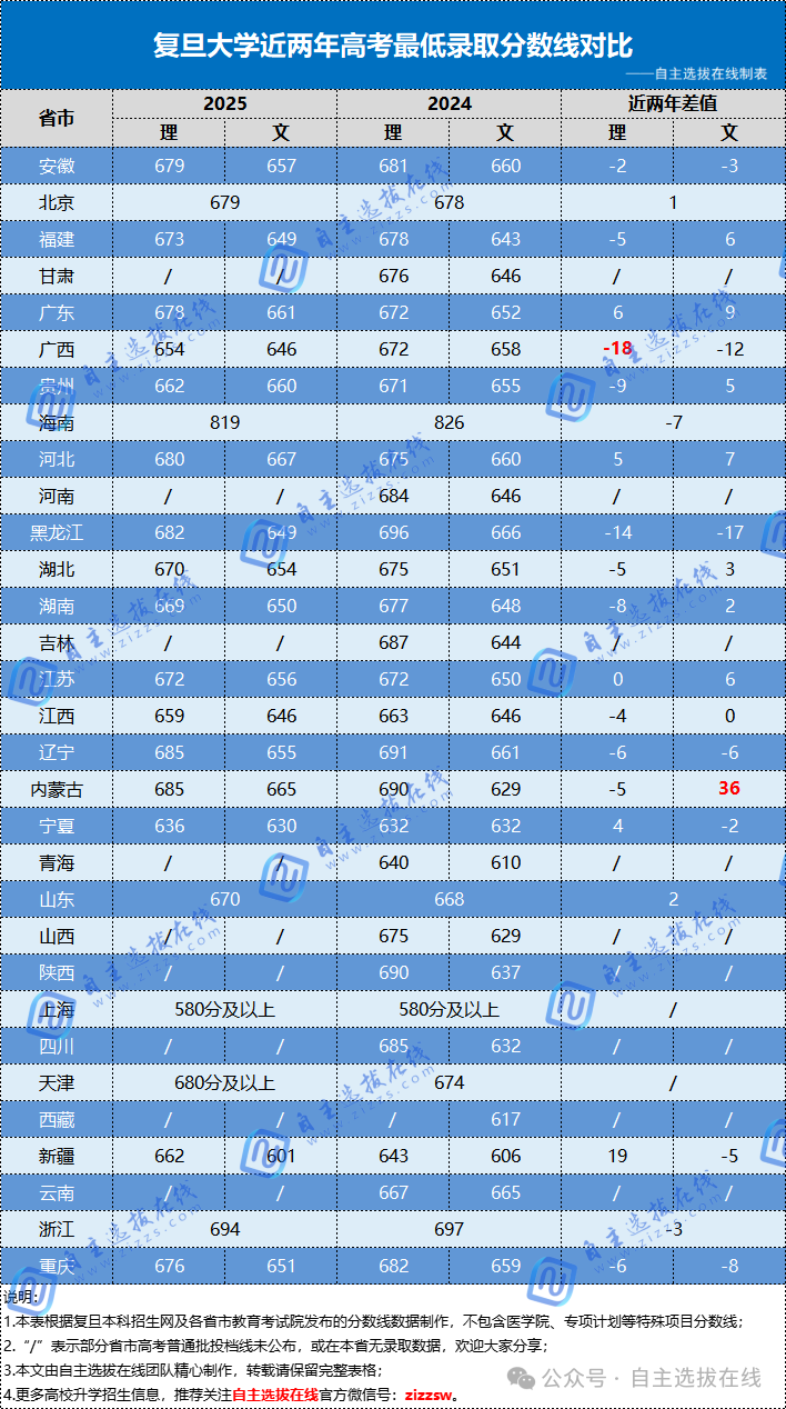 自主选拔在线团队汇总整理了复旦大学近两年各省市高考最低录取分数线对比,供各位考生家长参考。