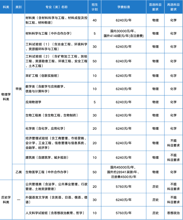注:高考文化课成绩高于A合格线获得考核资格的考生,学校结合考生填报志愿情况可在物理学科类甲类和物理学科类乙类专业(类)范围内进行录取(物理学科类甲类中材料科学与工程(中外合作办学)和物理学科类乙类中生物医学工程(中外合作办学)专业只招收有专业志愿的考生);高考文化课成绩高于B合格线未到达A合格线且所报专业中含物理学科类乙类专业志愿获得考核资格的考生,仅能录取至物理学科类乙类专业。