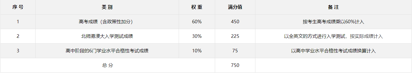 综合评价录取总成绩满分为750分。其中,高考成绩(含政策性加分)按60%的比例计入;北师港浸大入学测试成绩满分为225分,按实际成绩计入;考生高中阶段的思想政治、历史、地理、物理、化学、生物学6门学业水平合格性考试科目成绩均须达到合格,并按对应等级折算办法计入学业水平合格性考试成绩。
