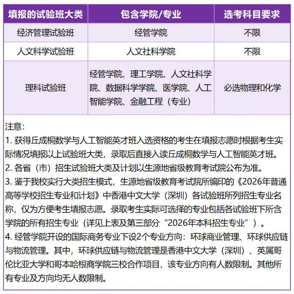 ◉ 有意向申请香港中文大学与香港中文大学(深圳)“跨学科数据分析+X双主修项目”、“航天科学与地球信息学+X双主修项目”或“材料科学与工程学+X双主修项目” 等项目(有关现有及2026年新增的项目信息详见招生官网)的学生在志愿填报期间或录取后选课前提交申请,并参加学校组织的考核,考核通过后方可入读。学生在深港两地校园轮换上课和实习,各修读两年。