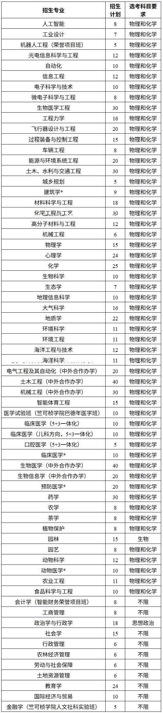 2025年浙江省“三位一体”综合评价招生总计划980名。按专业招生,各专业招生计划、高考选考科目要求详见下表。