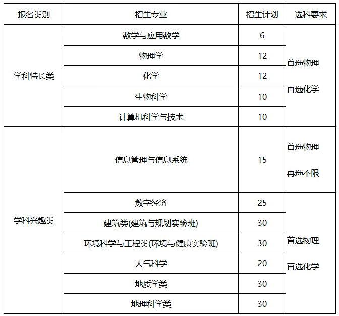 招生专业:数学与应用数学、生物科学、电子信息工程、物理学、心理学、计算机科学与技术、化学、理论与应用力学、网络空间安全、天文学、材料科学与工程环境科学、人文地理与城乡规划、电气工程及其自动化、人工智能共15个专业。